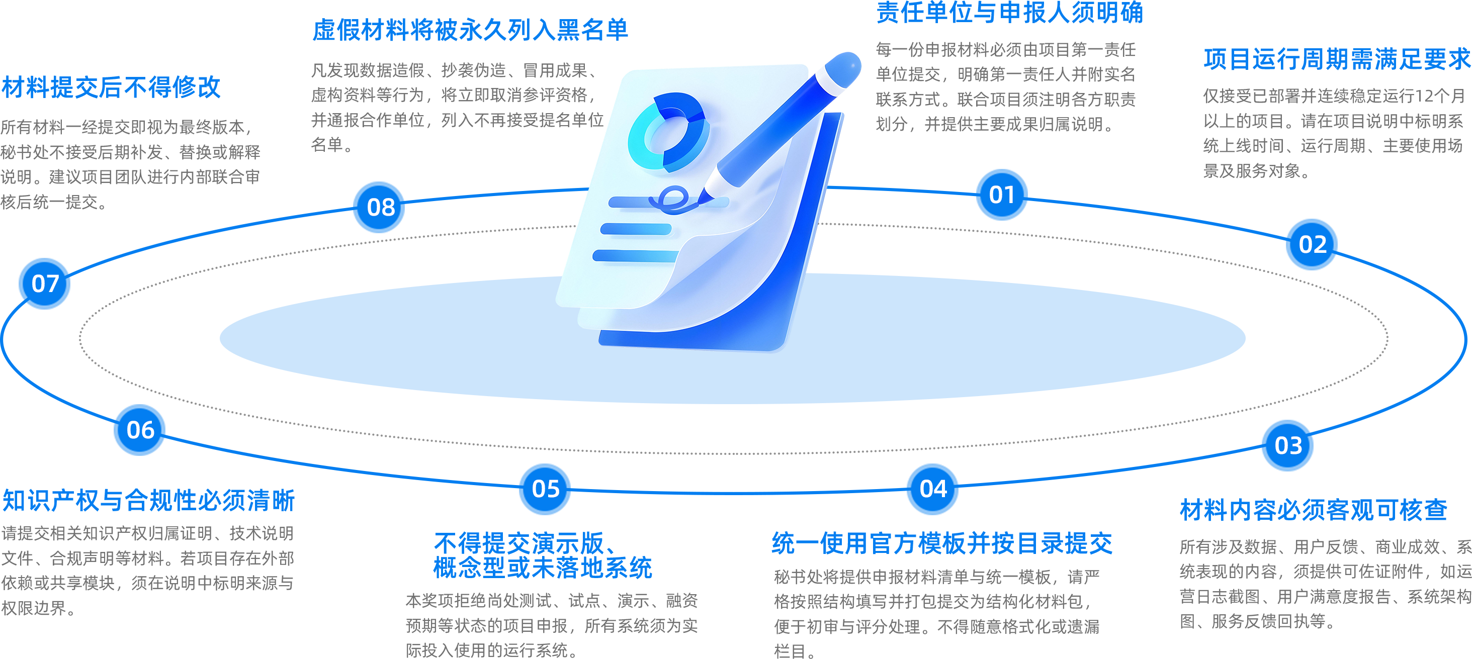 为确保申报资料规范、真实、完整,请所有参评单位在提交艾斯博产业智能应用奖提名材料前仔细阅读以下填写须知。所有资料将作为专家评审的核心依据,不接受任何口头补充或模糊性描述。